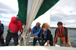 We found the whales on our first day back at sea – we must have a good luck charm on board! The poirpoises also came back with one playing around our boat while Jason went to pick up Val from the beach. It was Vals birthday and he brought cake with him – it was the first thing he made sure was safely on board when he arrived. The weather was the windiest and the sea the choppiest we have had so far so we hoisted the main sail! Which was a hilarious experience in itself – 6 students clinging to the boat while todd explained how to hoist the main sail and val jumping around with ease taking pictures – he really put us to shame! But we soon found our sea legs and took to moving around the boat with ease, sitting on the bow seat and even the trampoline (we got a bit wet!). I don’t think me, Garrett and Hana came in all day! We had wind, wonderful weather (sunshine) and whales what more could we ask for. Even though I must say trying to get good microphone recordings in the wind is hard! In the evening we anchored and got to try Val’s birthday cake and sing to him. We then headed off for walks in the woods and stretched our legs.