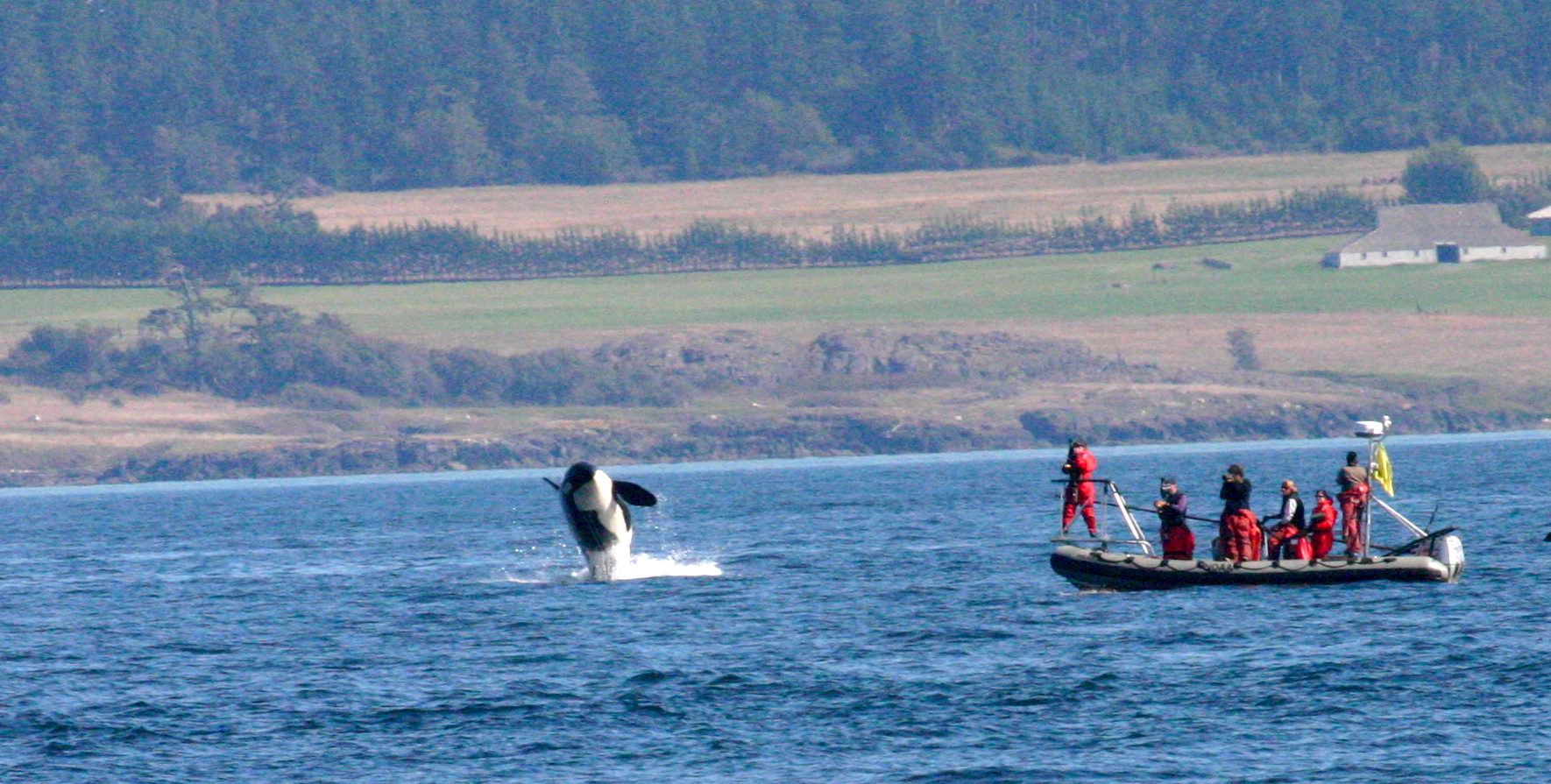 middle of the birds we were looking at! Then we saw another – it was sooooooooo cool, i even got some blow recordings. After a while the whales became less frequent and we were just chilling at the back of theboat when a seal pup came up right next to the boat (i could even see his flippers moving as he swam), i thought he would swim off but instead he swam right up to our back steps and a tried to climb on the boat!!! When that failed he swam through the middle of the hulls and under the trampoline!!!! It was very cool. We had to get moving after that and we all thought that would be the thing to write home about but it got even better! We headed out to false bay to catch up with the Orcas, and put our hydrophones in to get some recordings and i got my first successful in air recordings of the Orcas. I was merely recording after lunch when a group of females with their calves started performing some really cool behaviours. My recording was so funny it started out very sciency with me saying things like “female, j-pod, traveling, 150m” and as they got closer it changed to “oh my gosh i can’t believe what im seeing” as they started a greeting display with tail slaps, breeches, pectoral slaps, rolls and above surface calls (and i recorded it!). We were just processing what we had seen when out of the corner ouf our eyes we saw a sealion come up and joined the killer whales! Very weird – were they sharing food!!? On the way home we came across Dalls and Harbor porpoises bow riding with another boat! So our pinnipeds got larger and the day went on but our cetaceans got smaller!