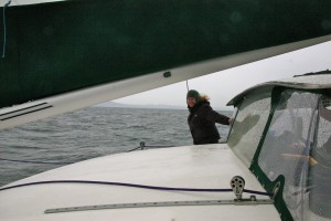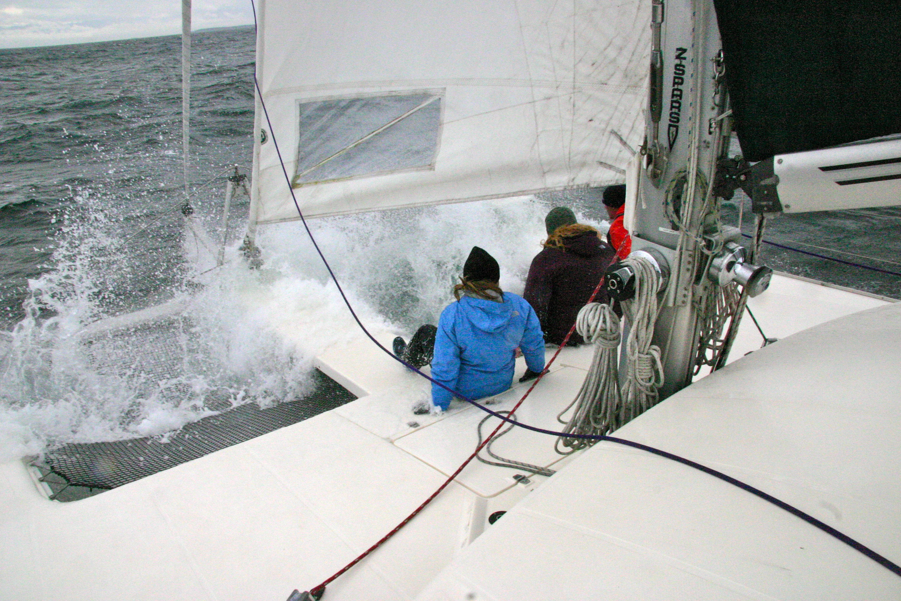 Thursday = FUN FUN FUN! It was the perfect day for sailing. We decided it was too choppy to get recordings so we had a sailing day. It was also a great chance to break out our rain gear. Hana looked like a ninja and Garrett was just a huge orange blob. I hoisted the mainsail and was surprised at my own strength, I think I surprised everyone else too! I didn’t go inside the whole time. The best bit of the day was when me, Megan and Garrett all sat on the edge of the trampoline and were getting splashed by the waves – it was like a rollercoaster. Garrett even sat completely on the trampoline and when we hit a wave he flew (yes actually flew) in the air it was hilarious. Sailing is officially the coolest way to travel.