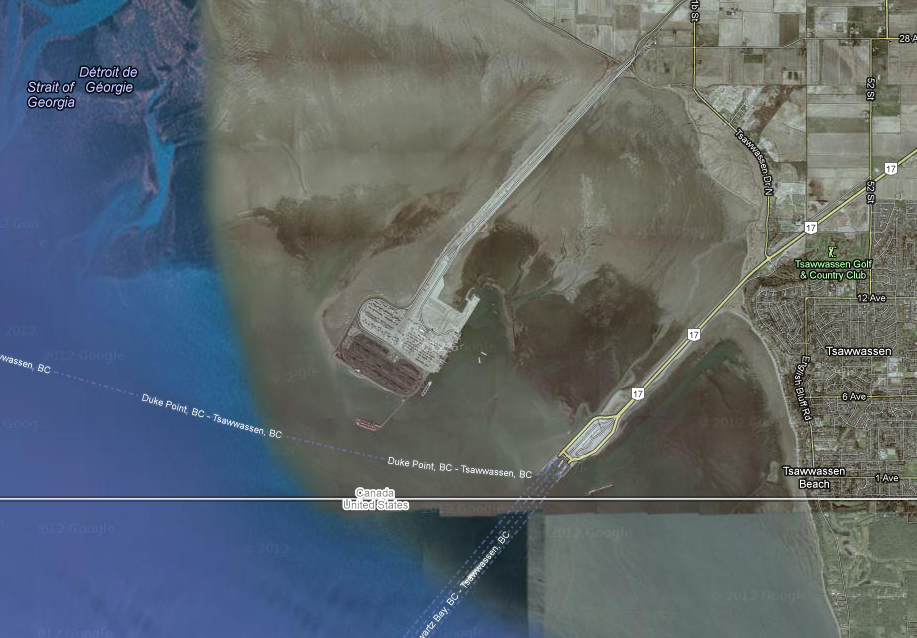 Docks for coal & ferries on the Fraser River delta. (Source: Google Maps)