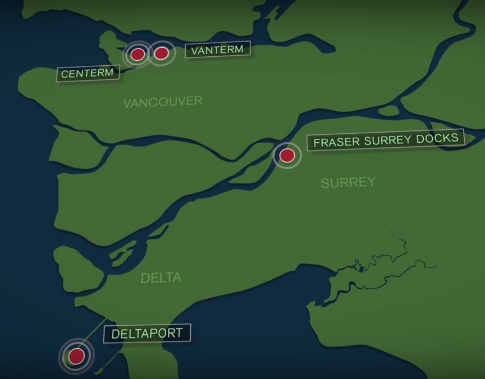 Map of shipping container ports near Vancouver, B.C.